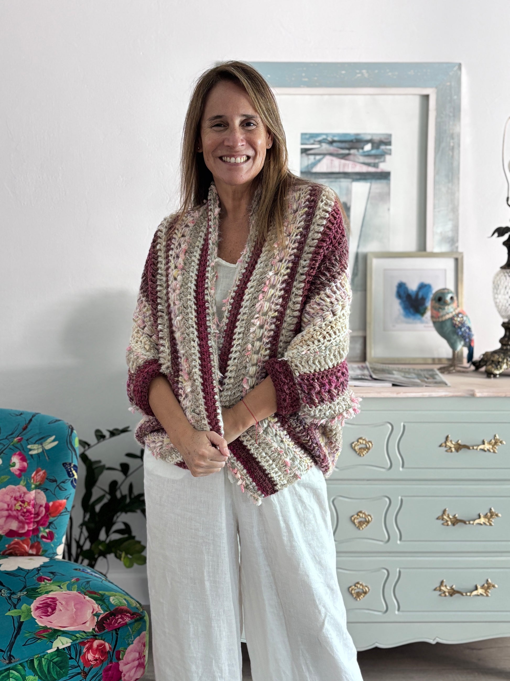 El Cardigan Inés es una prenda tejida a mano a crochet, que celebra la belleza de lo artesanal y lo auténtico. Su diseño de líneas verticales estiliza la silueta, mientras que la combinación de tonos crudos, rosados y burdeos aporta calidez y un encanto natural, lleno de detalles.