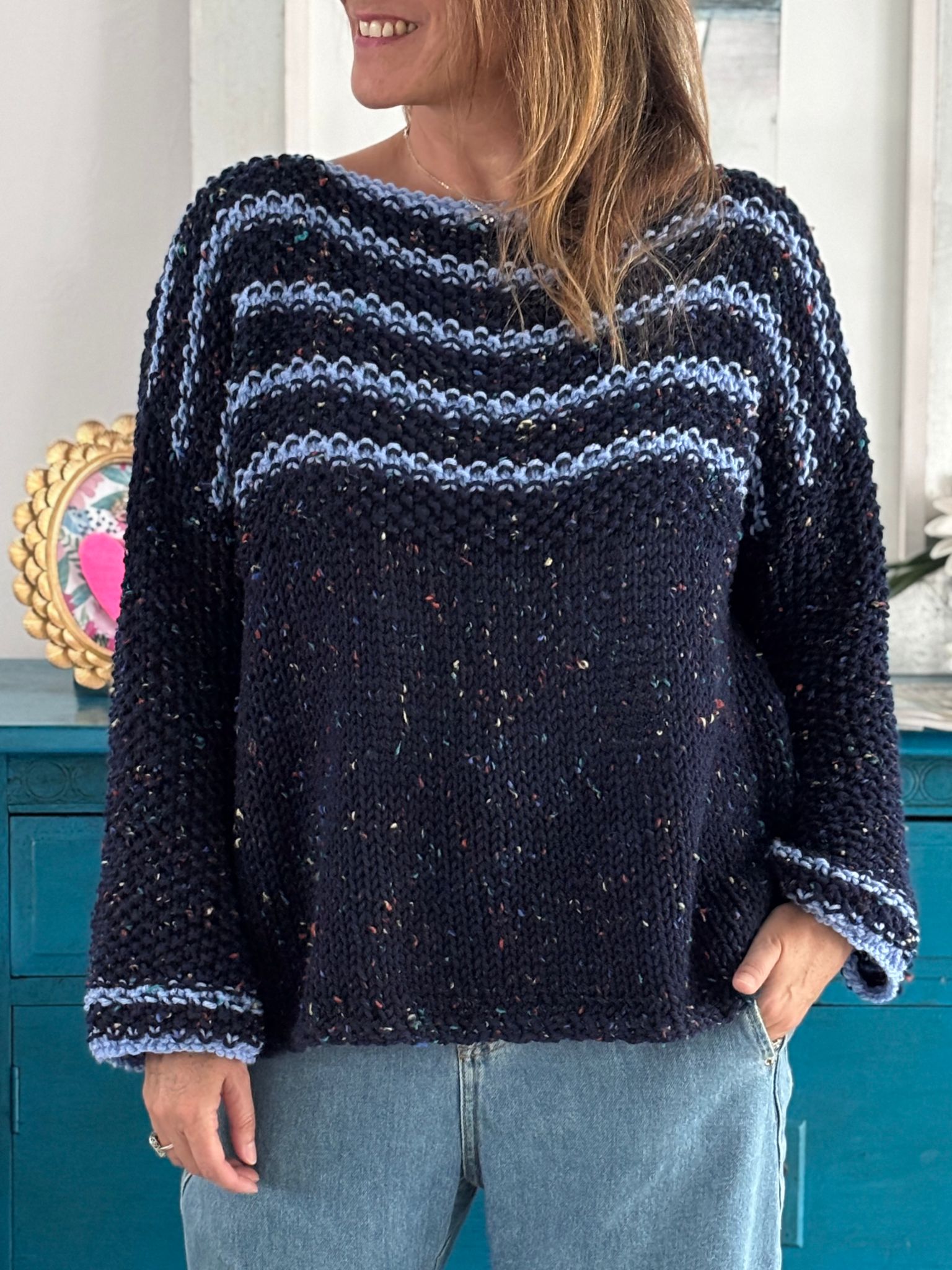 Prenda única tejida artesanalmente con lanas suaves y de calidad, en tonos naturales con delicadas franjas en contraste.
