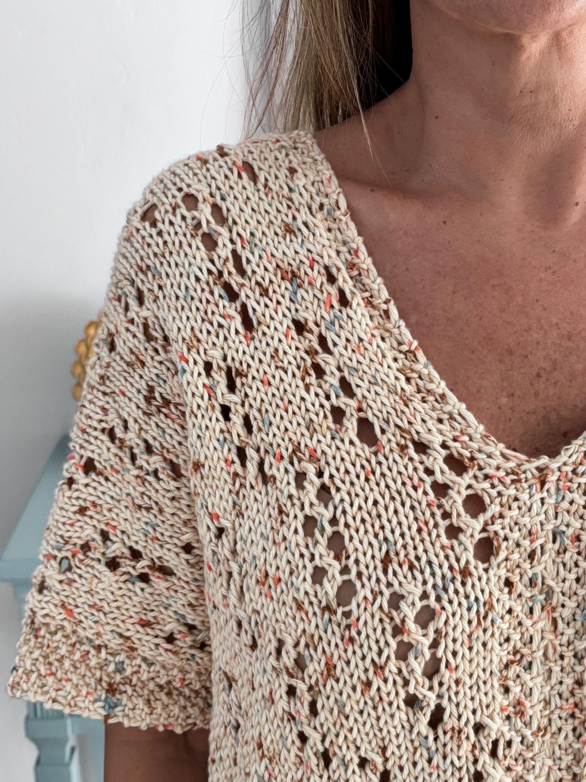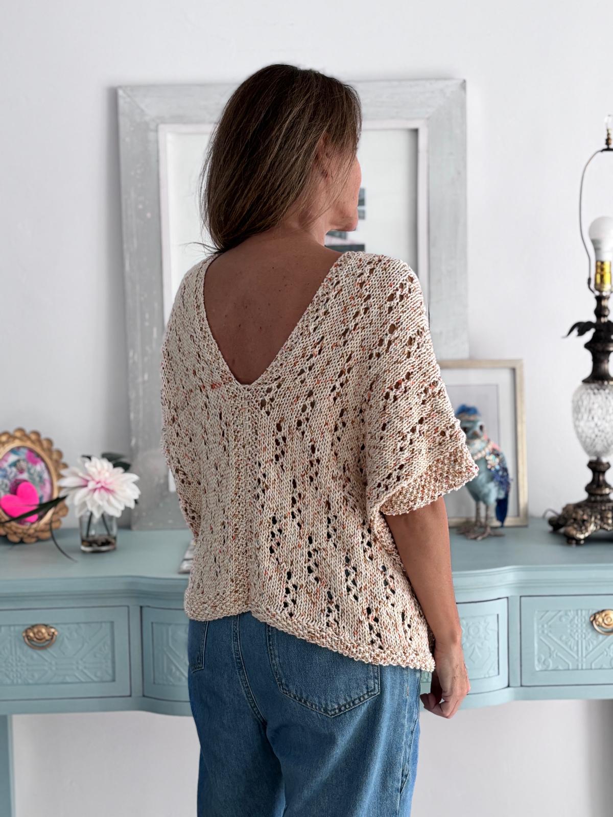 Este patrón te enseña a tejer un top calado con escote en V, de caída relajada y manga corta, con un juego de calados que se repite como una pequeña trama. Es liviano, respirable y súper combinable: con jeans, falda o sobre un vestido.